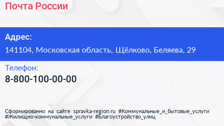 Почта России по адресу 141104, Московская область, Щёлково, Беляева, 29 в дальнейшем Организация, размещена в следующих категориях:
