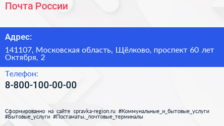 Почта России по адресу 141107, Московская область, Щёлково, проспект 60 лет Октября, 2 в дальнейшем Организация, размещена в следующих категориях: