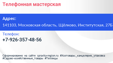 Телефонная мастерская по адресу 141103, Московская область, Щёлково, Институтская, 27Б в дальнейшем Организация, размещена в следующих категориях: