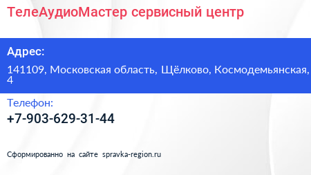 ТелеАудиоМастер, сервисный центр по адресу 141109, Московская область, Щёлково, Космодемьянская, 4 в дальнейшем Организация, размещена в следующих категориях: