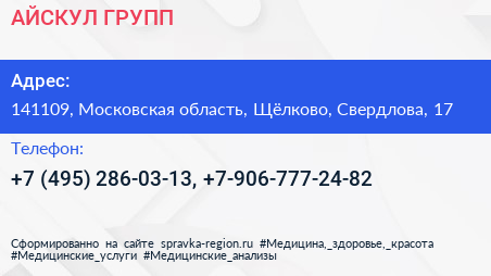 АЙСКУЛ ГРУПП по адресу 141109, Московская область, Щёлково, Свердлова, 17 в дальнейшем Организация, размещена в следующих категориях: