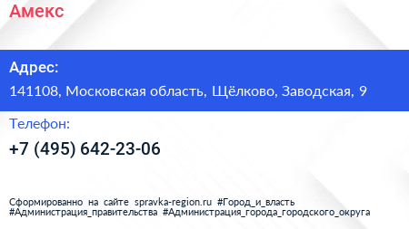 Амекс по адресу 141108, Московская область, Щёлково, Заводская, 9 в дальнейшем Организация, размещена в следующих категориях: