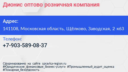 Дионис, оптово-розничная компания по адресу 141108, Московская область, Щёлково, Заводская, 2 к63 в дальнейшем Организация, размещена в следующих категориях: