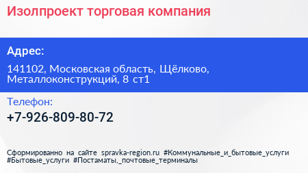 Изолпроект, торговая компания по адресу 141102, Московская область, Щёлково, Металлоконструкций, 8 ст1 в дальнейшем Организация, размещена в следующих категориях: