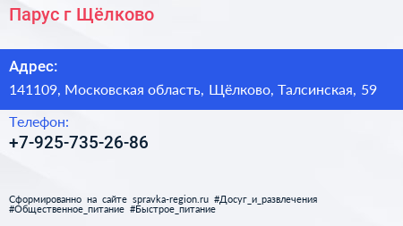 Парус, г. Щёлково по адресу 141109, Московская область, Щёлково, Талсинская, 59 в дальнейшем Организация, размещена в следующих категориях: