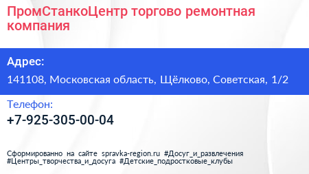 ПромСтанкоЦентр, торгово-ремонтная компания по адресу 141108, Московская область, Щёлково, Советская, 1/2 в дальнейшем Организация, размещена в следующих категориях: