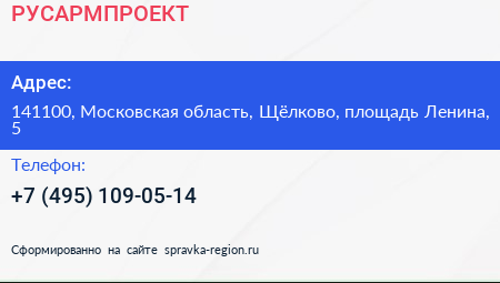 РУСАРМПРОЕКТ по адресу 141100, Московская область, Щёлково, площадь Ленина, 5 в дальнейшем Организация, размещена в следующих категориях: