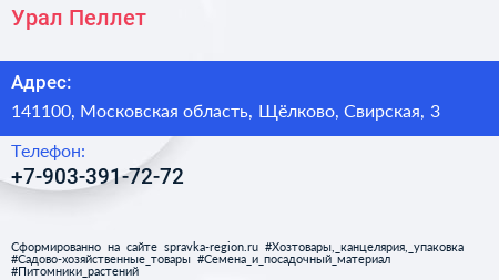 Урал Пеллет по адресу 141100, Московская область, Щёлково, Свирская, 3 в дальнейшем Организация, размещена в следующих категориях: