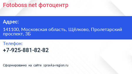 Fotoboss.net, фотоцентр по адресу 141100, Московская область, Щёлково, Пролетарский проспект, 3Б в дальнейшем Организация, размещена в следующих категориях: