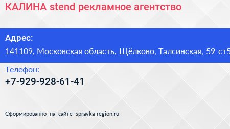 КАЛИНА-stend, рекламное агентство по адресу 141109, Московская область, Щёлково, Талсинская, 59 ст5 в дальнейшем Организация, размещена в следующих категориях: