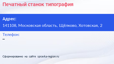 Печатный станок, типография по адресу 141108, Московская область, Щёлково, Хотовская, 2 в дальнейшем Организация, размещена в следующих категориях: