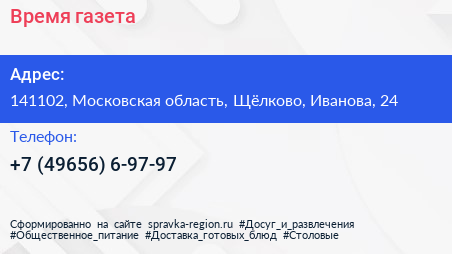 Время, газета по адресу 141102, Московская область, Щёлково, Иванова, 24 в дальнейшем Организация, размещена в следующих категориях: