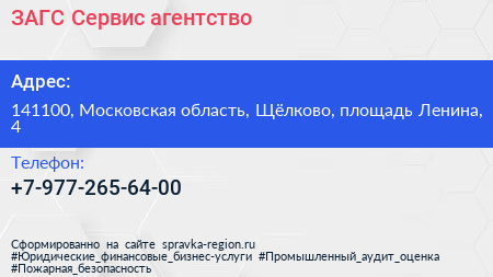 ЗАГС-Сервис, агентство по адресу 141100, Московская область, Щёлково, площадь Ленина, 4 в дальнейшем Организация, размещена в следующих категориях: