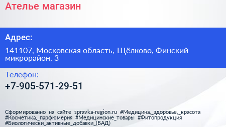 Ателье-магазин по адресу 141107, Московская область, Щёлково, Финский микрорайон, 3 в дальнейшем Организация, размещена в следующих категориях: