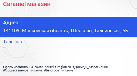 Caramel, магазин по адресу 141109, Московская область, Щёлково, Талсинская, 6Б в дальнейшем Организация, размещена в следующих категориях:
