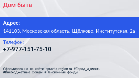 Дом быта по адресу 141103, Московская область, Щёлково, Институтская, 2а в дальнейшем Организация, размещена в следующих категориях: