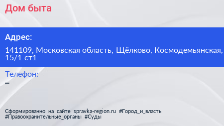 Дом быта по адресу 141109, Московская область, Щёлково, Космодемьянская, 15/1 ст1 в дальнейшем Организация, размещена в следующих категориях: