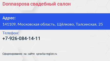 Donnasposa, свадебный салон по адресу 141109, Московская область, Щёлково, Талсинская, 25 в дальнейшем Организация, размещена в следующих категориях: