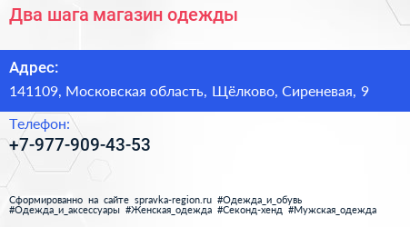 Два шага, магазин одежды по адресу 141109, Московская область, Щёлково, Сиреневая, 9 в дальнейшем Организация, размещена в следующих категориях: