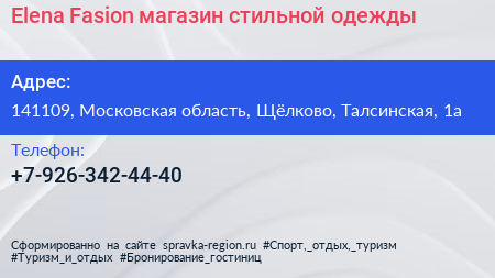 Elena Fasion, магазин стильной одежды по адресу 141109, Московская область, Щёлково, Талсинская, 1а в дальнейшем Организация, размещена в следующих категориях: