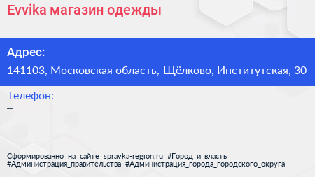 Evvika, магазин одежды по адресу 141103, Московская область, Щёлково, Институтская, 30 в дальнейшем Организация, размещена в следующих категориях: