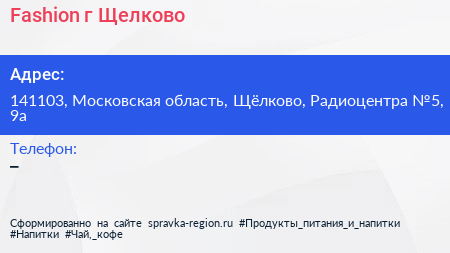 Fashion, г. Щелково по адресу 141103, Московская область, Щёлково, Радиоцентра №5, 9а в дальнейшем Организация, размещена в следующих категориях: