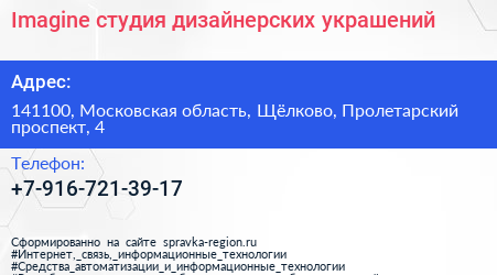 Imagine, студия дизайнерских украшений по адресу 141100, Московская область, Щёлково, Пролетарский проспект, 4 в дальнейшем Организация, размещена в следующих категориях: