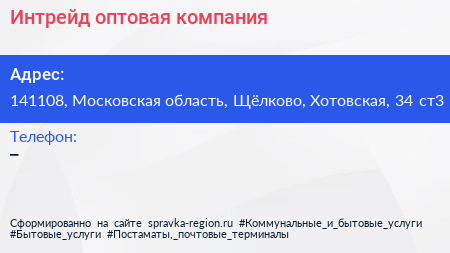 Интрейд, оптовая компания по адресу 141108, Московская область, Щёлково, Хотовская, 34 ст3 в дальнейшем Организация, размещена в следующих категориях:
