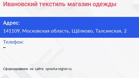 Ивановский текстиль, магазин одежды по адресу 141109, Московская область, Щёлково, Талсинская, 2 в дальнейшем Организация, размещена в следующих категориях: