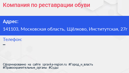 Компания по реставрации обуви по адресу 141103, Московская область, Щёлково, Институтская, 27г в дальнейшем Организация, размещена в следующих категориях: