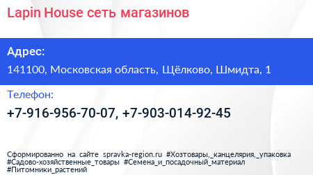 Lapin House, сеть магазинов по адресу 141100, Московская область, Щёлково, Шмидта, 1 в дальнейшем Организация, размещена в следующих категориях: