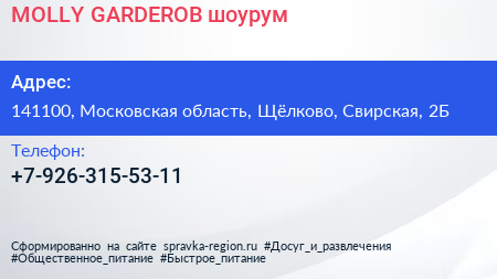 MOLLY GARDEROB, шоурум по адресу 141100, Московская область, Щёлково, Свирская, 2Б в дальнейшем Организация, размещена в следующих категориях: