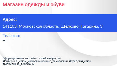 Магазин одежды и обуви по адресу 141103, Московская область, Щёлково, Гагарина, 3 в дальнейшем Организация, размещена в следующих категориях: