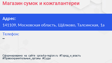 Магазин сумок и кожгалантереи по адресу 141109, Московская область, Щёлково, Талсинская, 1а в дальнейшем Организация, размещена в следующих категориях: