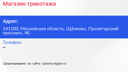 Магазин трикотажа по адресу 141100, Московская область, Щёлково, Пролетарский проспект, 9Б в дальнейшем Организация, размещена в следующих категориях: