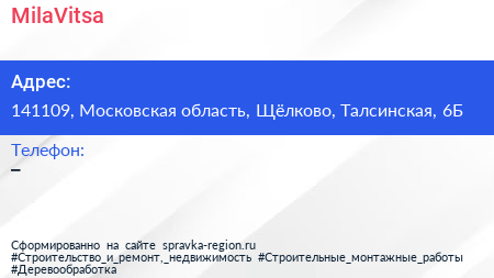 MilaVitsa по адресу 141109, Московская область, Щёлково, Талсинская, 6Б в дальнейшем Организация, размещена в следующих категориях: