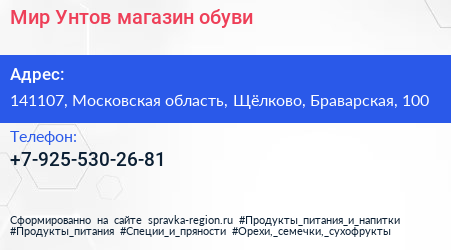 Мир Унтов, магазин обуви по адресу 141107, Московская область, Щёлково, Браварская, 100 в дальнейшем Организация, размещена в следующих категориях: