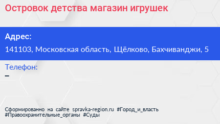 Островок детства, магазин игрушек по адресу 141103, Московская область, Щёлково, Бахчиванджи, 5 в дальнейшем Организация, размещена в следующих категориях:
