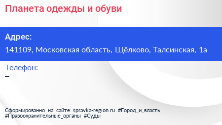 Планета одежды и обуви по адресу 141109, Московская область, Щёлково, Талсинская, 1а в дальнейшем Организация, размещена в следующих категориях: