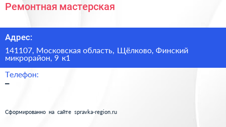 Ремонтная мастерская по адресу 141107, Московская область, Щёлково, Финский микрорайон, 9 к1 в дальнейшем Организация, размещена в следующих категориях:
