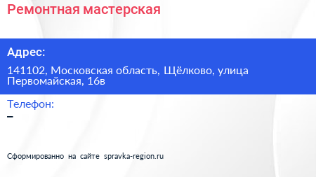 Ремонтная мастерская по адресу 141102, Московская область, Щёлково, улица Первомайская, 16в в дальнейшем Организация, размещена в следующих категориях: