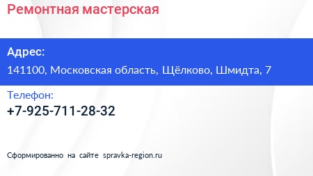 Ремонтная мастерская по адресу 141100, Московская область, Щёлково, Шмидта, 7 в дальнейшем Организация, размещена в следующих категориях: