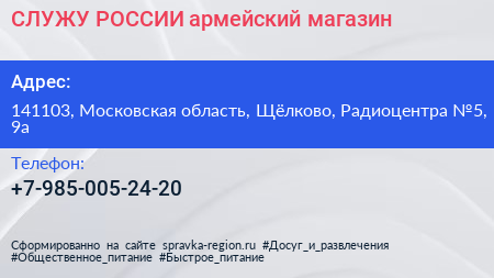 СЛУЖУ РОССИИ, армейский магазин по адресу 141103, Московская область, Щёлково, Радиоцентра №5, 9а в дальнейшем Организация, размещена в следующих категориях: