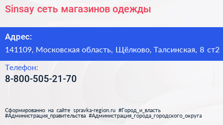 Sinsay, сеть магазинов одежды по адресу 141109, Московская область, Щёлково, Талсинская, 8 ст2 в дальнейшем Организация, размещена в следующих категориях: