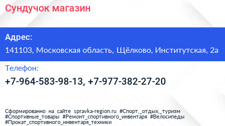 Сундучок, магазин по адресу 141103, Московская область, Щёлково, Институтская, 2а в дальнейшем Организация, размещена в следующих категориях: