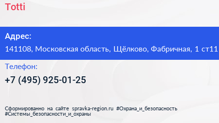 Totti по адресу 141108, Московская область, Щёлково, Фабричная, 1 ст11 в дальнейшем Организация, размещена в следующих категориях: