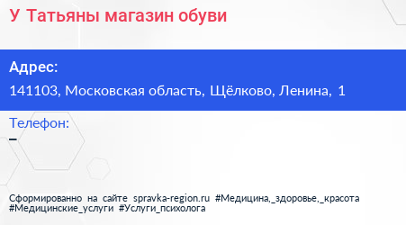У Татьяны, магазин обуви по адресу 141103, Московская область, Щёлково, Ленина, 1 в дальнейшем Организация, размещена в следующих категориях: