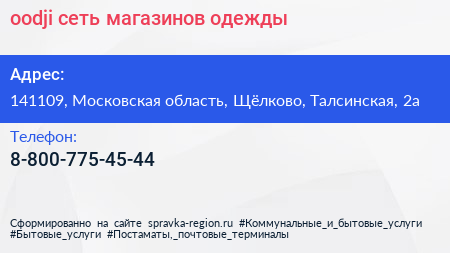 oodji, сеть магазинов одежды по адресу 141109, Московская область, Щёлково, Талсинская, 2а в дальнейшем Организация, размещена в следующих категориях: