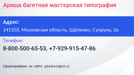 Ариша, багетная мастерская-типография по адресу 141103, Московская область, Щёлково, Супруна, 2а в дальнейшем Организация, размещена в следующих категориях: