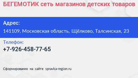 БЕГЕМОТИК, сеть магазинов детских товаров по адресу 141109, Московская область, Щёлково, Талсинская, 23 в дальнейшем Организация, размещена в следующих категориях: